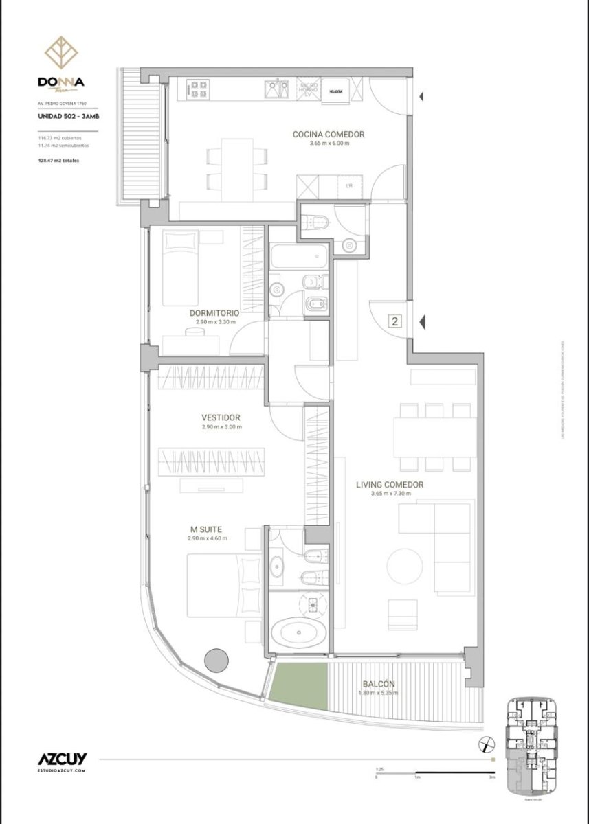 Departamento de 3 ambientes en venta – DONNA Terra, Av. Pedro Goyena, Caballito Ubicado en el edificio DONNA Terra, desarrollado por Azcuy, se ofrece a la venta departamento de 4 ambientes transformado a 3 con gran vestidor en dormitorio principal de 128 m² totales (117 m² cubiertos), situado en el 5° piso sobre Av. Pedro Goyena al 1700, en el barrio de Caballito. La unidad cuenta con entrada principal por palier privado y acceso de servicio independiente con ascensor para mudanzas, garantizando privacidad y comodidad. Distribución: • Amplio living comedor con salida a balcón principal orientación norte, con excelente luminosidad natural. • Cocina independiente con comedor diario y salida a balcón lateral. • Toilette de recepción. • Dormitorio principal en suite, con vestidor y baño completo, con vista abierta a la arbolada de Av. Pedro Goyena. • Dormitorio secundario con baño completo. La propiedad incluye una cochera en segundo subsuelo. Amenities del edificio: • Estación de bicicletas para uso de propietarios • Gimnasio • Spa con sauna y sala de relax • Piscina y solárium • Salón de eventos totalmente equipado en entrepiso • Dos parrilleros en piso 22 con vistas panorámicas a la ciudad El edificio cuenta con servicio de seguridad las 24 horas. Excelente opción para quienes buscan una propiedad de categoría, con amplias superficies, servicios premium y una ubicación estratégica. Toda la información del aviso, incluyendo medidas, precio, impuestos, servicios, etc. son estimativos, sujetos a modificación y no vinculantes, según lo dispuesto en el art. 973, Cód. Civ. y Com.